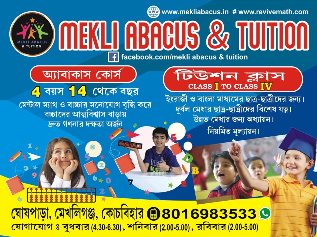 Welcome to Mekli Abacus & Math Academy, your trusted learning center in Mekhliganj. We provide comprehensive tuition in Mathematics and English for both English Medium (ICSE board) and Bengali Medium students, ensuring a strong academic foundation in these essential subjects. Additionally, we offer Abacus Mental Arithmetic courses designed to enhance children's cognitive skills, focus, and speed in mental calculations. Our mission is to make learning enjoyable and effective, helping every child excel academically and reach their full potential. --- This now includes your offerings for both English and Bengali medium students!